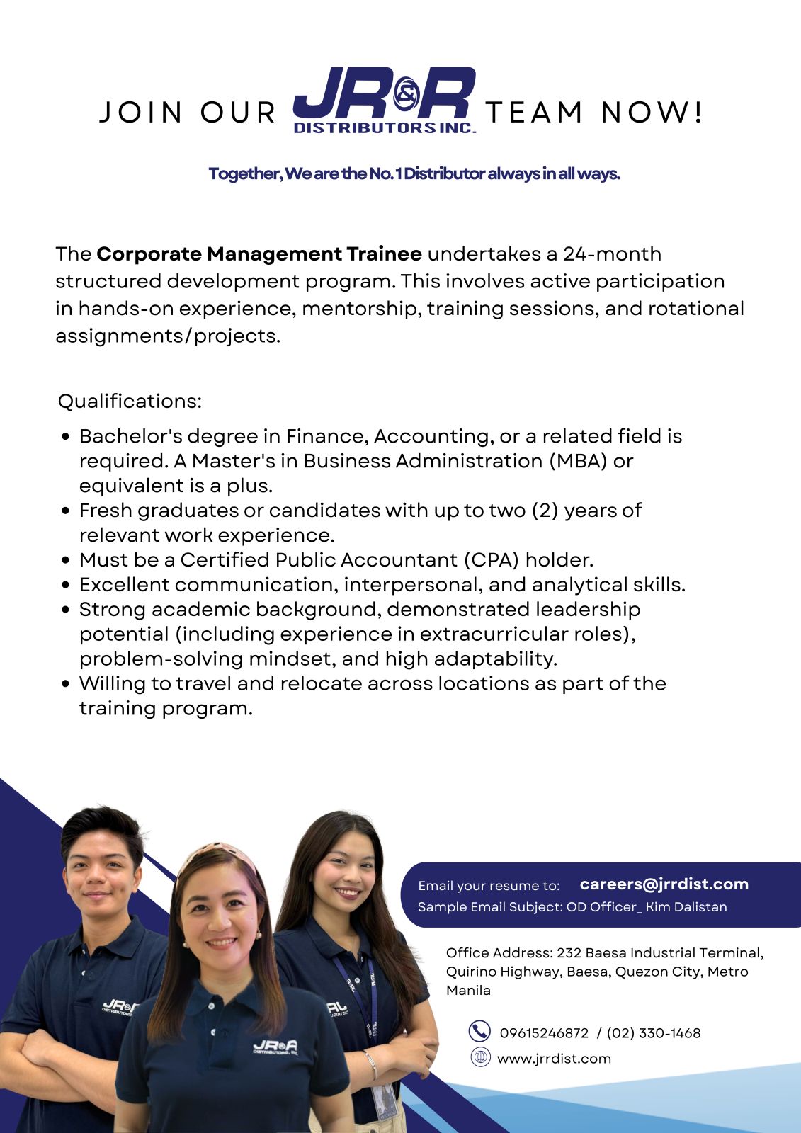 • Willingness to work in Baesa Industrial Terminal, Quirino Highway, Quezon City.